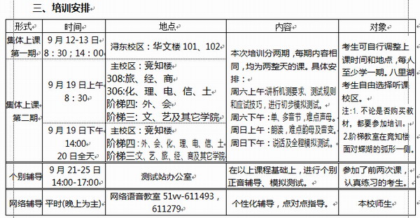 四、培训方式:面对面培训与网络教学结合,请大家多交流,尽量不要闭门独自练习。面对面培训分为集体上课和个别辅导;网络培训包括畅言网和到语音教室与老师语音交流。