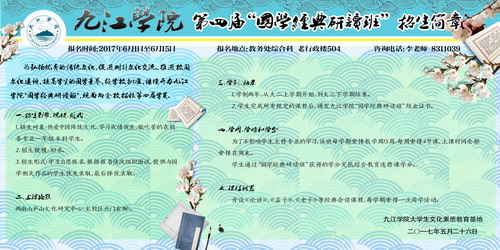 为弘扬优秀的传统文化,促进对外文化交流,推进校园文化建设,提高学生的国学素养,经学校批准,继续开办九江学院“国学经典研读班”,现面向全校招收第四届学员。