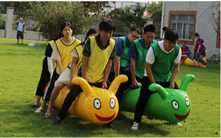 比赛要求:(1)场地平整,不能有其他比较大的杂物。(2)10人一组,需紧抓把手,保持毛毛虫不接地的情况下,先到终点为胜。(3)赛程中,不得在地上拖拉器械前进,否则根据拖拉情况裁判酌情处罚,加时10秒。行进中每名队员都必须手持把手,任何人不得脱离器械前进,否则每次加时5秒。(4)比赛根据抽签形式,每一组3个分会同时进行比赛。