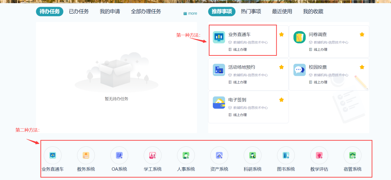 1. 融合门户已实现办公系统(含老办公系统)、人事管理系统、图书管理系统、教务系统、资产管理系统、科研管理系统、教学平台系统、学工系统、实验室系统、宿管系统、教学评估系统的单点登录。后续将根据业务部门需要,逐步集成其他业务系统。用户登录统一身份认证平台后便可直接访问有访问权限的业务系统,不需要再次输入密码。具体操作方式如下,访问业务系统可以打开“首页”-“推荐服务”中“业务直通车”或业务系统导航条进行点击跳转。(如下图所示)