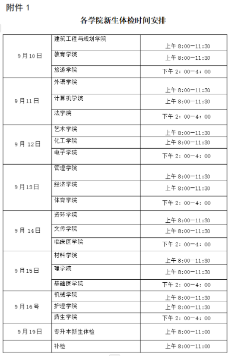 附件一:各学院新生体检时间安排