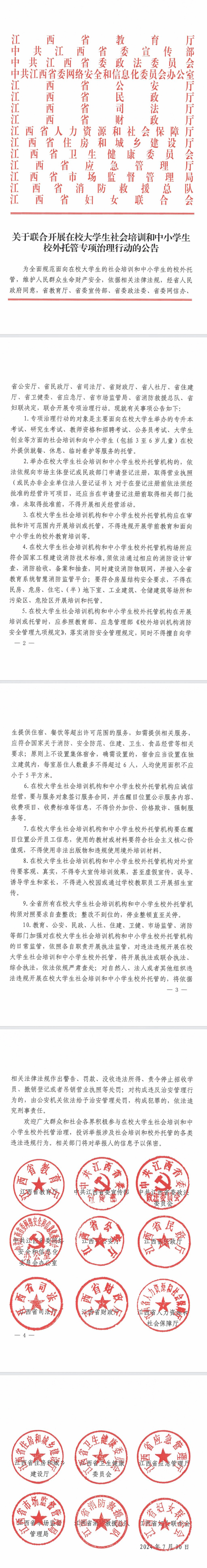 附件:《关于联合开展在校大学生社会培训和中小学生校外托管专项治理行动的公告》