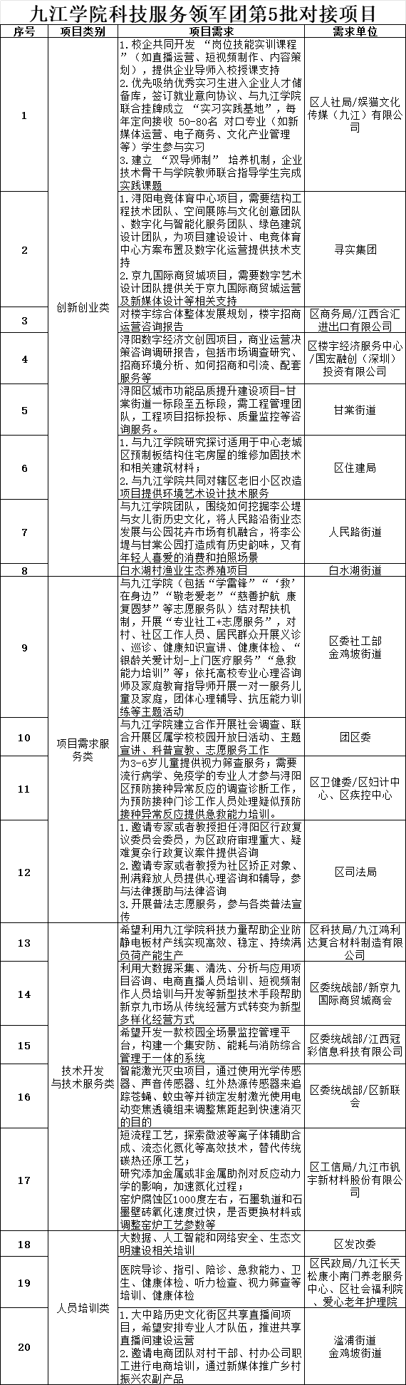 为贯彻落实《九江学院服务九江经济社会发展三年行动计划(2024-2026)》(九院党字〔2024〕66号)文件要求,通过科技服务领军团对浔阳区经济社会发展相关需求进行征集,确定以下20项为第5批社会服务项目,现面向全校发布项目信息。