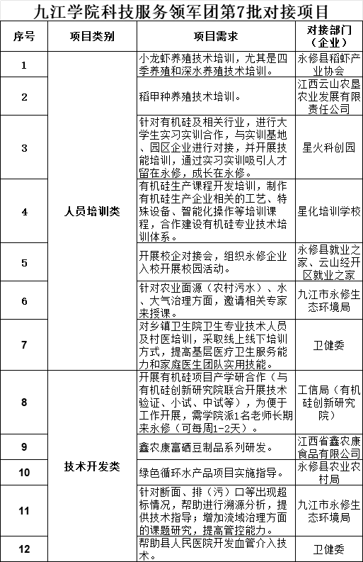 为贯彻落实《九江学院服务九江经济社会发展三年行动计划(2024-2026)》(九院党字〔2024〕66号)文件要求,通过科技服务领军团对永修县经济社会发展相关需求进行征集,确定以下12项为第7批社会服务项目,现面向全校发布项目信息。
