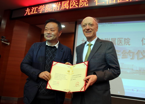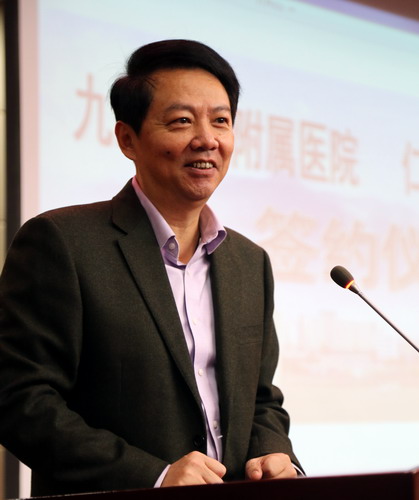 仪式上,校党委书记郑翔发表了热情洋溢的讲话。他说,我到九江学院工作后,经常想一个问题,全国大学有2000多所,新建本科院校有600多所,九江学院如何在短时间里崭露头角,赢得地位?我们党有一个好的传统,就是在敌强我弱的时候,在局部战场上形成优势,最后取得胜利。事情的道理是一样的。那么永利yl23411集团官网的局部优势要从哪里做起呢?两年前我们首先是抓特色教育,包括好习惯教育、国学素养教育和创业教育;其次是开展抢占学术制高点活动;第三就是柔性引进国内和国际高水平学术团队,与国内外高水平的专家教授合作形成我们的特色和优势。目前学校已经引进了三个高水平学术团队。前不久我们引进了德国音乐艺术家团队,将来有可能把国际声乐大赛引进到九江,之前这是不可想象的。这次我们引进了国际高端乳腺肿瘤一流团队,周永昌教授是亚洲在乳腺肿瘤治疗方面的一把手,Giuseppe Viale教授是欧洲在乳腺肿瘤治疗方面的一把手,还有两名日本著名教授,他们都是国际乳腺肿瘤治疗方面的著名专家。我们选择在局部进行高位嫁接,就有可能在短时间内形成别人也许用20年时间都无法赶上的优势。我们希望引进这个高水平的医疗团队,把九江地区乳腺肿瘤治疗带入一个高水平,希望九江地区兄弟医院的专家学者加入我们这个团队。今天的合作是一个开头,学校将办一个国际医疗算术研究所,目前世界上只有美国的哈佛大学、英国的剑桥大学才有这个研究所,我们是第三个。为了支持这个研究所,学校把南湖校区拿出来给研究所使用,将来以乳腺肿瘤治疗为起点形成我们的优势,这是学校的战略考虑。希望临床医学院/附属医院理解这个战略考虑,支持这个战略考虑,共同把这个研究所办好。