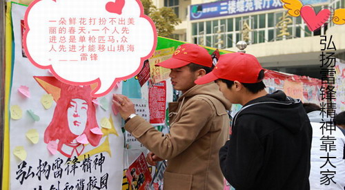 2015年3月5日是毛泽东“向雷锋同志学习”题词发表52周年纪念日。为推进学雷锋常态化,凸显学雷锋活动成效,九江学院师生深入开展内容丰富、形式多样的学雷锋主题教育活动,积极开展以“青春志愿行 共筑九院梦”为主题的青年志愿者服务月活动,以实际行动传递当代雷锋精神,弘扬志愿者精神,传播志愿服务文化。
