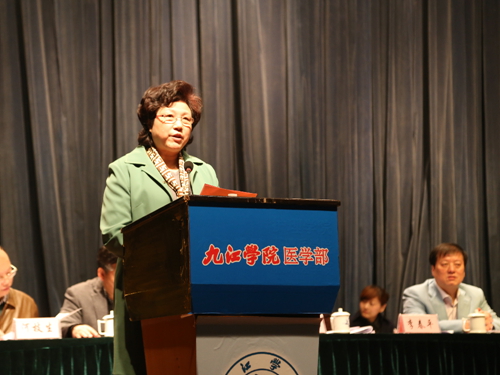 大会在庄严的国歌声中拉开序幕。吴桃娥副校长致辞,她代表学校对临床医学院过去一年多来取得的成绩表示诚挚的祝贺,对付出辛勤劳动的医院广大干部职工表示亲切的慰问,对临床医学院各项事业的发展与建设表示会继续给予高度重视和大力支持。吴副校长指出,过去一年,临床医学院按照学校党政领导的工作部署和要求,强有力地抓执行力建设,坚持持续改进,不断追求卓越,硬件和软件水平都实现了质的飞跃,学科体系更加健全,医教相长相互促进,全员育人卓有成效,医疗质量显著提升,患者就医体验满意,各项经济指标稳步提高,医院领导有决心,职工有信心,医院精神面貌发生了巨大的变化,各方面工作都上了一个新的台阶。学校领导对我院求真务实、具有战斗力、能谋事会干事且干成事的领导班子予以充分认可,对全院干部职工为医院取得良好的社会效益和经济效益付出的努力奋斗给予高度肯定,并在医疗质量、教学水平、医院管理、就医服务四个方面提出要求,希望2015年医院干部职工要抢抓机遇、大干快上,在进一步加强内涵建设的同时,要加快新门诊综合大楼的建设、加快国家级全科医生临床培养基地的建成并投入使用、顺利通过教育部对临床医学专业的认证评估和力争临床医学专业硕士学位点的成功申报,又要把未来五年的发展规划做好,相信临床医学院一定会全面实现既定目标,实现新时期的新发展、新飞跃。