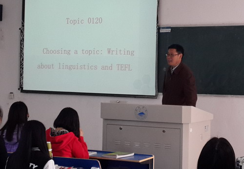 4月14日上午,吴桃娥副校长来到香远楼414教室,同外国语学院A1292班同学一起听了张金福教授讲授的《英语学术论文写作》课程。外国语学院院长韩琨一同听课。