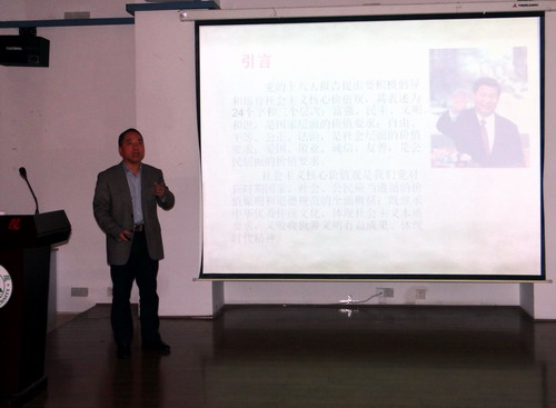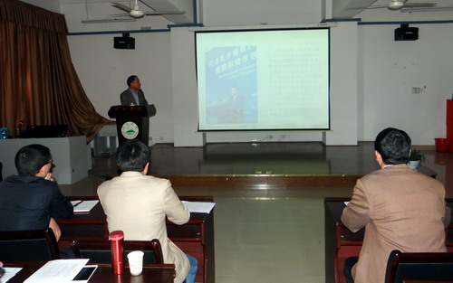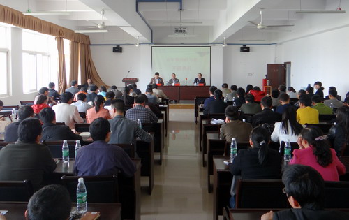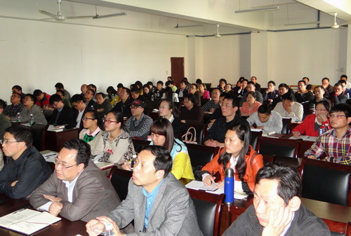 典礼结束后,甘筱青校长为研习营活动作了题为《社会主义核心价值观与师德修养》首场报告。报告前,甘校长将传统文化格言并配以一幅幅优美的画面及悠扬的乐曲逐一展示给大家欣赏,使大家从典礼热闹的气氛中立刻沉浸到对中华优秀传统文化的品味与感悟中。随后,甘校长通过引经据典、旁征博引、谈古论今, 从社会主义核心价值观切入,结合学习中华传统文化,坚持依法治国和以德治国相结合,与老师们探讨师德修养的认识。报告主要从四个方面进行阐述:第一、教书育人,以德为先。人可一生不仕, 但不可一日无德,调强了人的德才素质中,“德”是“统帅”,是“根本”,它决定着“才”的施展力度与用力方向。第二、儒家思想与师德修养。甘校长通过对“勤俭、谨慎、利义、学习”等儒家思想的剖析,由表及里,鼓励各位青年教师以平常心做人、以进取心做事,不断加强政治理论与专业知识的学习,生活上勤俭朴素,做人做事谦虚谨慎、不骄不躁,工作上励精图治、无私奉献。第三、立德树人乃教育之本。立德方能树人,治学先要修身。大学不仅仅是职业训练所,更是塑造学生品行和综合素质的地方,教师职业的本质特性,不仅仅是要授业、解惑,更重要的是“传道”,就是影响人的心灵,提升人的人格境界。对于教师来说,师德修养是一个永恒的话题,每一位教师只有努力地克服所有问题,加强师德修养,才能与时俱进,登上一个个新高峰。第四:九江学院的文化育人。学校坐落于庐山之麓、长江之畔、鄱湖之滨,名山、名江、名湖赋予了学校特有的文化底蕴。在校园文化建设中,学校大力弘扬以庐山为地标的优秀传统文化,以优美的自然环境陶冶人、以高尚的人文景观启迪人、以深厚的传统文化熏陶人,在山江湖学科建设工程、校训、校徽、校园道路命名中既彰显出浓郁的九江地域特色又折射出强烈的时代精神。同时甘校长还饶有兴趣地向青年教师介绍了学校的两大文化品牌——濂溪学堂、白鹿洞书院,以及“庐山文化传承与传播协同创新中心”。最后甘校长以白鹿洞书院的“七心精神”:专心立品、潜心读书、澄心烛理、虚心求益、实心任事、平心论人、公心共学,办好人民满意的大学,与在坐教师共勉,并邀请研习营教师到白鹿洞书院一游,亲身感受书院文化的熏陶。