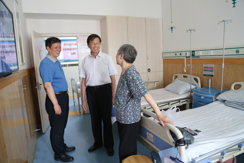 视察中,蒋如铭亲切慰问临床医学院/附属医院医护人员,并和蔼地和住院病友交谈。来到内分泌病区,蒋副主任仔细询问患者王阿姨在医院的就医情况、住院环境感受和身体恢复情况。王阿姨高兴地说:“谢谢领导关心,我现在恢复得很好,在附属医院看病很放心,医生都能根据我的具体情况用医用药,护士服务和善周到,而且现在住院条件很好、整洁干净,跟在家一样,现在天气热,空调等各种供应都很好很舒服”。蒋副主任详细、认真地了解临床医学院/附属医院医疗服务质量安全等各项工作后,留下了深刻的印象,非常赞赏临床医学院/附属医院现阶段取得的显著成就。