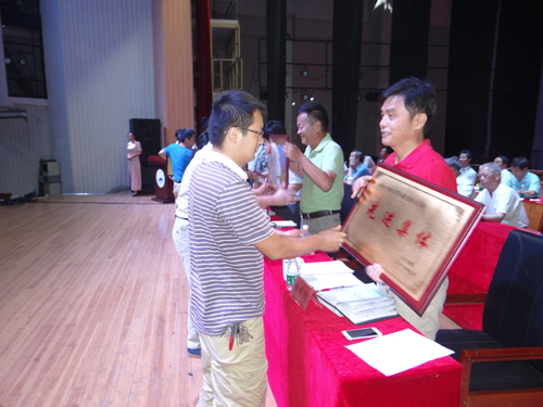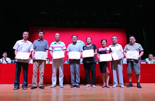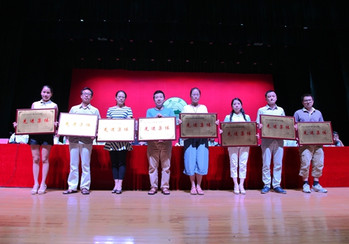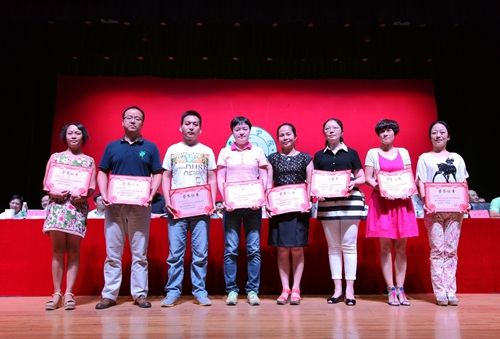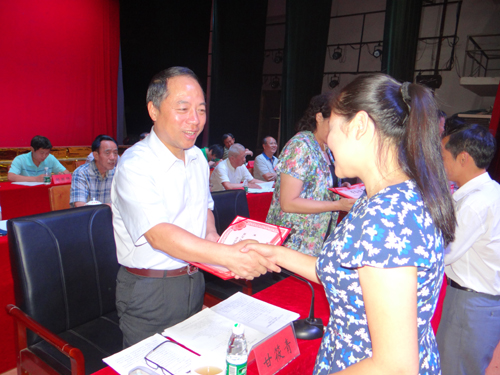 在欢快的乐曲和全场热烈的掌声中,校领导为先进集体、先进个人和从教三十年以上教师代表颁奖。