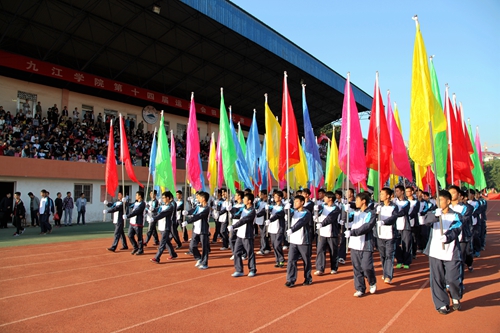 青春的脚步,快如金秋之风;绽放的笑容,灿若春晓之花。10月15日上午8时,秋风送爽,丹桂飘香。操场上彩旗招展,红旗飘扬。九江学院第十四届田径运动会炫彩开幕。校领导郑翔、甘筱青、纪岗昌、王万山、陶春元、杨焱林、魏立平、杨耀防出席开幕式并在主席台就坐。第十四届运动会组委会全体成员和万余名师生代表参加了开幕式。开幕式由第十四届运动会组委会副主任、副校长陶春元主持。