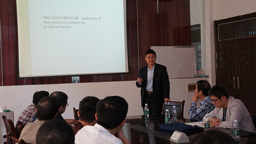 美国国立卫生研究院研究员、教育部心血管重大疾病防治协同创新中心特聘客座教授和首席科学家蔡涛博士在庐峰校区一教113教室为实验室团队做了“精准医学:基因组技术的临床应用”的讲座,精准医学(Precision Medicine)是一种预防和治疗疾病的新方法,其考虑个体基因差异、环境因素以及个人生活方式等影响,目前主要在某些癌症筛查方面取得明显进展,但并未应用到其他大多数疾病的诊治。今年1月奥巴马总统提出的精准医学计划,将彻底改变医学和加快精准医学理念融入日常临床实践的步伐。蔡博士介绍了精准医学的概念及基因组技术的临床应用,为大家提供了一个全新的而有效的研究思路和方法。