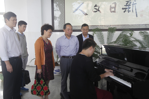 听课结束后,甘校长还对文传学院校园文化建设的开展情况进行了调研。在文友楼大厅,文传学院摆放了一台钢琴,鼓励同学们利用课间时间自行演奏。甘校长称赞文传学院把高雅文化带到了学生们中间,让同学们随时随地可以享受高雅文化的熏陶。他希望文传学院充分利用好这一平台,并在条件允许的情况下,能够在固定的时间安排具有专业特长的同学在这里为大家演奏,让师生们在音乐声中净化心灵,形成健康向上的文化氛围。