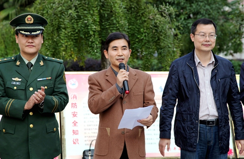 在第二十五个“119”消防宣传日的到来之际,11月4日下午,永利yl23411集团官网2015年119消防宣传月启动仪式在向学广场举行。校纪委书记魏立平、庐山区消防大队参谋邓雨欣,校保卫处、学生处、文传学院、理学院、会计学院、化环学院等部门负责人及学生代表约400余人参加了此次消防宣传及运用消防器材进行灭火的演练活动。