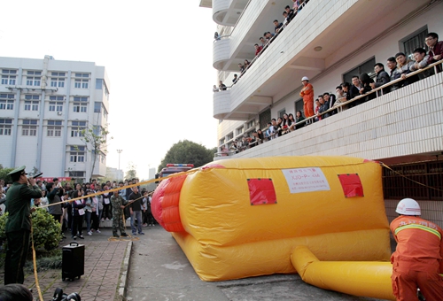 随后,消防官兵及保卫处人员组织了联合演习。模拟火灾现场,教学生们如何正确地使用灭火器,派几名学生亲自演练,并且在紧急的火灾情况下,消防官兵亲自模拟紧急情况,教学生们如何使用正确的方式从高处逃生。此次消防宣传活动学校尤为重视,九江电视台、庐山区电视台等媒体记者也到现采访报道,在向学广场四周也摆放了关于消防知识的展示牌,以供学生学习。这次119消防宣传活动月不仅加强了学生们对于消防知识的进一步了解,也从一定程度上提高了学生们在紧急火灾发生时逃生技能。