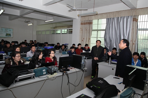 12月14日上午,甘筱青校长来到电子实验楼203教室听取电子工程学院江金龙副教授为本科通信工程专业A1311、A1312班讲授的《DSP课程设计》实验课。教务处副处长许礼生、电子工程学院副院长胡日新一同听课。