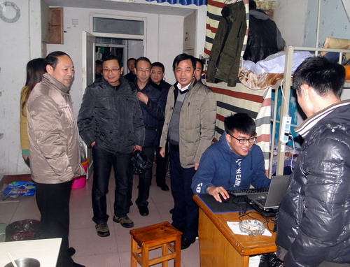 纪副校长一行首先来主校区学生宿舍25栋,查看了宿舍安全和垃圾袋装化情况。当看到学生宿舍干净整洁时,纪副校长给予肯定。他要求宿管中心加强对学生进行安全教育,继续抓好宿舍卫生,保持宿舍的整洁。在学生宿舍,纪副校长看到有的学生在复习,也有个别同学在睡觉和玩游戏,他及时对这些学生进行教育,希望同学们珍惜时间,努力学习,考出好成绩。