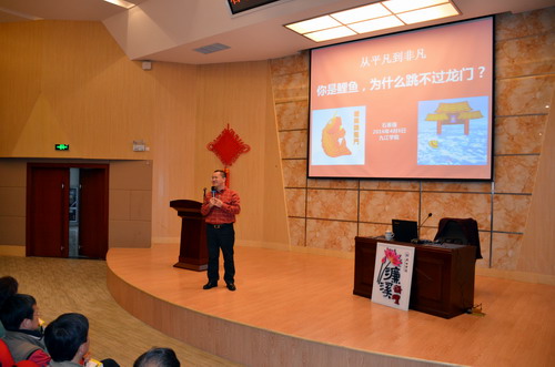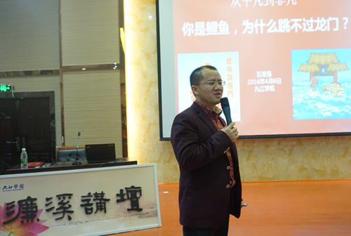 讲座中,石章强先生以独特的“鲤鱼跳龙门十三问”、“鲤鱼们的八大误区”、“鲤鱼跳龙门的九阴真经”为主线,以详实的示例为辅,紧密联系我国经济发展的实际,联系大学生的思想和工作实际,为大家解读了一些普遍关心的问题。他希望同学们能避免存在“一心想去沿海大城市”、“非大企业不去”、“专往热门行业挤”、“必须薪水高”、“一定得从事营销工作”、“非管理岗位不干”、“怎么着得弄个主管或经理当当”、“最好是三五年就五子登科”等错误理念,表示罗马不是一天建成的,一天建成的也不是罗马,它需要的是积累、沉淀、总结和经历的综合。