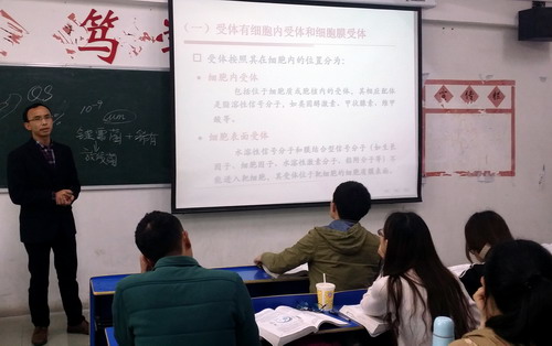 陈川老师主要授课内容为“细胞信号传导的分子机制”,详细介绍了细胞信号传导的概述和细胞内信号传导分子的分类及基本方式,通过图文并茂,以图释文的方式,增强了同学们对理论知识的理解。陈川老师在授课过程中,语言连贯,条理分明,与学生互动性强。杨副校长在课堂上聚精会神,认真地做着笔记。