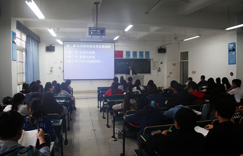课堂上,刘红雨老师运用PPT课件展示了教学的主要内容:马克思主义哲学基本原理——第二章认识的本质及其发展规律。为了使同学们更好地理解和掌握“认识与实践的辩证关系”的基本概念和重点、难点问题,他通过举例的方式,进行了形象生动地讲解。
