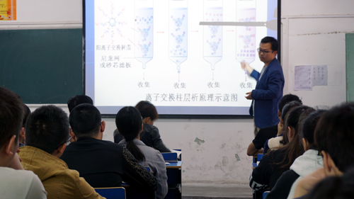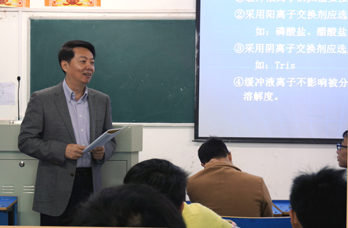 课堂上,李同建老师先复习了上节课的内容,然后对“离子交换剂的分类与性质和离子交换剂的选择”等内容进行了详细的讲解。李老师讲解过程语言通俗易懂,将理论知识与实践操作紧密联系,课堂气氛比较活跃。郑书记与同学们一起专注听课,并认真地做着听课记录。