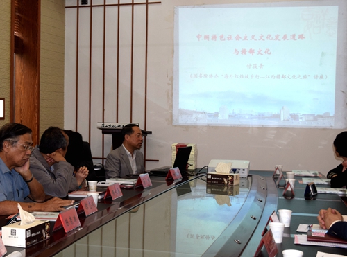会上,甘校长作了题为“中国特色社会主义文化发展道路与赣鄱文化”专题讲座。从中国古代文化发展道路中分析中华文化“一主多元”的对话模式,从社会主义文化与中西文化的价值对话中肯定了“马克思主义中国化”和社会主义核心价值观的现实意义,总结了全球化背景下文化发展的三大发展战略任务:1.“以理服人”,提升国际话语权;2.坚持中西交融,开展文明对话;3.创新传播体系,重建社会信仰。