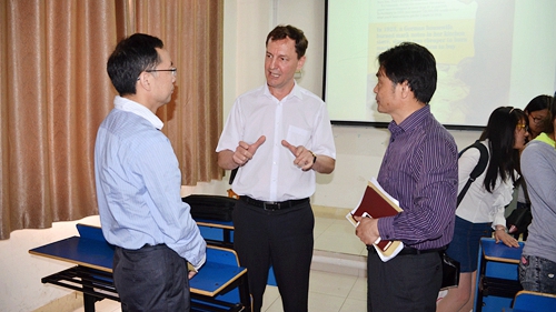 5月27日上午,杨耀防副校长来到义丰楼412教室,听了经管学院中英合作班外籍教师Andrei Munteanu 讲授的《商务环境》课程。国际交流学院院长夏修龙,经管学院院长潘旭华、党委书记花金龙等一同听课。