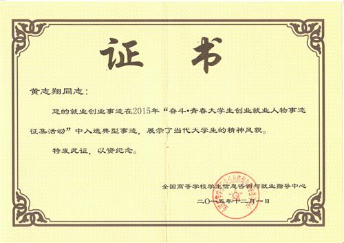2015年,全国高等学校学生信息咨询与就业指导中心开展了 “奋斗·青春”——大学生创业就业人物事迹征集活动。经过学院推荐、省级筛选、全国就业指导中心严格评选,最终,外国语学院黄志翔同学成功入选“奋斗·青春大学生创业就业人物事迹的活动”典型事迹。此次全国高校共评选出105人入选“奋斗·青春”大学生创业人物事迹典型事迹,江西省高校共有5人入选。