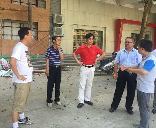 在施工现场,杨耀防副校长具体了解国资处10多个重要工程和采购项目实施状况和计划,详细询问了项目实施过程中的工艺流程、质量控制、实施计划和安全施工等各方面的措施和管理状况,并认真听取施工单位、监理单位和国资处项目负责人的现场汇报。他对在建项目的进度和质量予以认可,并对国资处工作人员放弃暑假,努力工作一线的作风给予充分肯定。