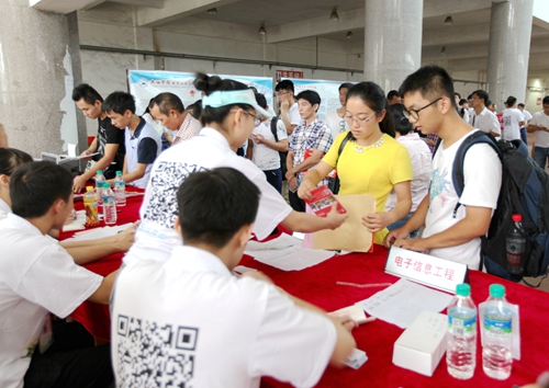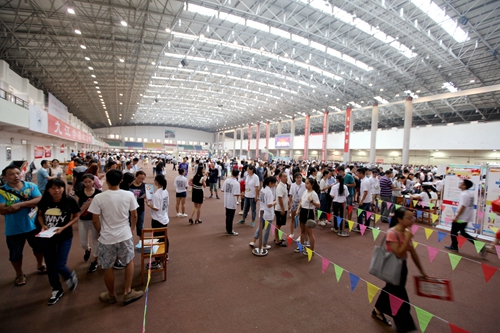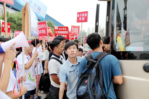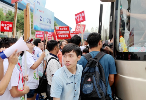 上午7:30开始,接新生的校车一辆接一辆抵达校室内田径馆新生报到处,大约每5分钟就有一班从火车站和汽车站迎新归来的校车。而负责接待的志愿者早已翘首等待在迎新总站的门口,用他们最直接最热情的方式迎接着每一位奔赴九江学院求学的学弟学妹们。总是可以看到每批校车抵达之际,热情的志愿者高举各院标志牌,沿着车窗高呼自己院系的名字,热切接待着来自祖国各地的学弟学妹们。