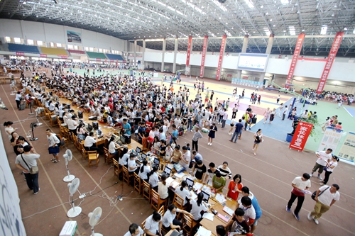 不仅田径馆门外热闹非凡,场馆内更是人声鼎沸。早已做好充分准备的校迎新现场各部门和各二级学院的老师与同学热情地接待了每一位经历了舟车劳顿的新生们。