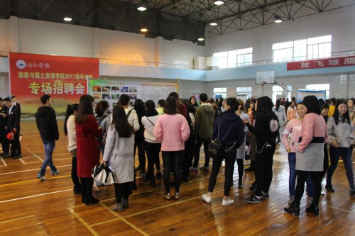 11月13日上午,旅游与国土资源学院2017届毕业生专场招聘会在南区体育馆隆重举行。副校长纪岗昌、夏启国,招就处及旅游与国土资源学院负责同志一起到招聘会现场指导工作,看望了用人单位代表和毕业生。