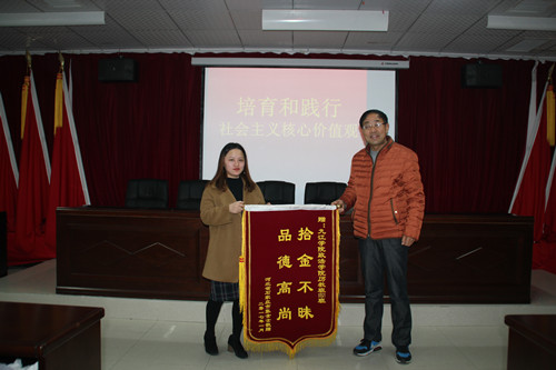 活动由团委宋品品老师讲述“最帅男生”故事拉开了序幕。据校园新闻报道,“最帅男生”为政法学院B1521班的王星同学。为表达对王星同学行为的肯定,失主张女士分别给九江学院政法学院、九江学院政法学院历史教育班及王星同学寄来感谢锦旗。高翔书记代表政法学院赠与了历史教育班一面班级荣誉锦旗。高翔书记表示,在日常学习生活中,我们要时刻践行社会主义核心价值观,学习王星同学拾金不昧的行为。同时也强调,政法学院在以后践行好习惯教育、国学教育以及在诚信教育的过程中都需要每一位同学的参与和努力,争取成为下一个“最帅男生”或者“最美女生”!