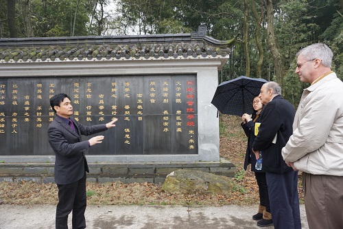 会后,访问团成员一行在副校长杨耀防的陪同下前往校园新区青衿园、五柳湖等地参观,杨副校长耐心地为访问团成员介绍九江学院的校园景观,在白鹿洞书院学规的石碑前,为他们讲述中国古代书院的教育方针,“博学之,审问之,慎思之,明辨之,笃行之”,访华团成员被九江学院优美的校园风光所深深吸引。