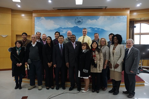 萨凡纳州立大学国际教育中心主任伊曼纽尔(Emmanuel)发表致辞。他代表萨凡纳州立大学校长多齐尔(DOZIER)对九江学院两年多以来对孔子学院的支持与帮助和此次的热情接待表示衷心的感谢。他指出,在与九江学院合作的过去两年多里,孔子学院在中方院长罗其娟和外方院长布拉德(PEGGY BLOOD)的领导和辛勤工作下,通过教授汉语语言和举办文化活动,让更多的人了解了中国文化,取得了可喜的成绩。希望九江学院和萨凡纳州立大学未来继续加强合作,继续开展师生交流和学术研究等项目,促进两校以及两校合作创办的孔子学院取得更好的发展。最后宾主双方互赠纪念品并合影留念。