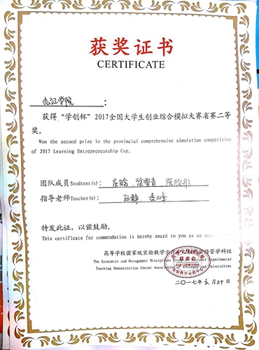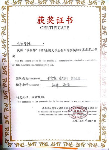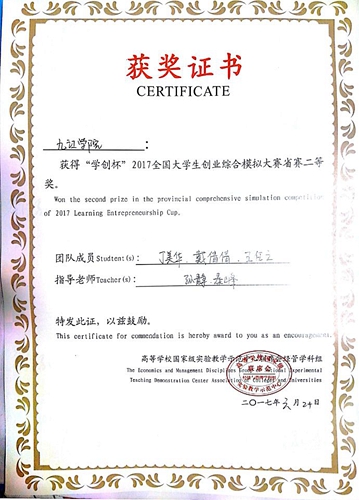 近日,由国家级实验教学示范中心联席会经管学科组主办的“学创杯”2017全国大学生创业综合模拟大赛江西省赛圆满结束。由经管学院人力资源专业教研室组织参加,经过几个月的认真备赛,在经管学子参加省赛的六支队伍中,有三支队伍获得江西省赛二等奖。