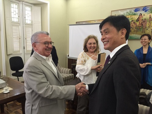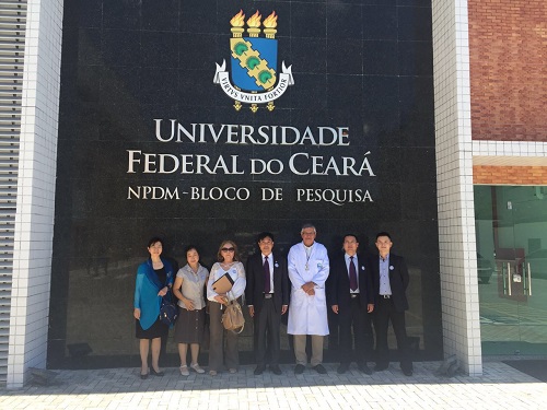 11日至12日,九江学院访问团一行来到了巴西塞阿拉州联邦大学,校长Henry Campos教授和国际交流中心负责人Jose Soares教授、医学院Odorico Moraes主任等热情接待,杨耀防副校长用ppt英文简要介绍了九江学院的情况,侧重介绍附属医院中医学科的现状和建设发展历史,重点从针炙、拔火罐、艾灸、康复等方面介绍我国传统医学在疾病治疗和康复方面的特色和优势,强调祖国传统医学在疾病治疗中的作用。双方就教师互访、学生交换、学术交流合作,以及就医学、药学和植物的研究、计算机及软件开发等进行了亲切的交谈和探讨,并达成初步意向,签署了中、英和葡三种文本的意向性合作交流备忘录。期间访问团一行还考察和参观了塞阿拉州联邦大学药物研发中心和计算机网络软件与系统工程中心,两个中心负责人Odorico Soares教授和Rossana Andrade教授分别陪同访问团一行并作了详细介绍。