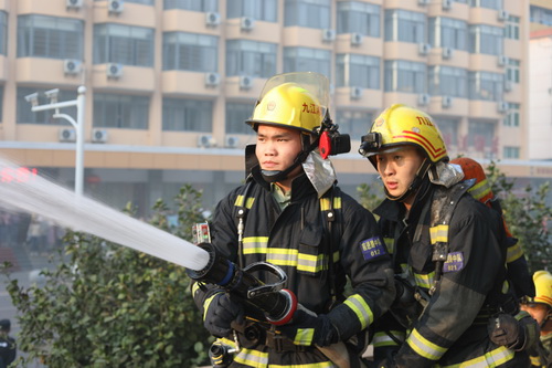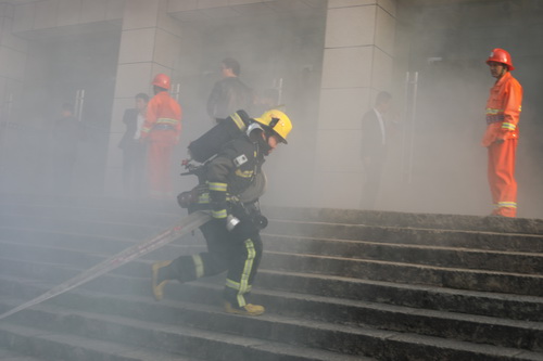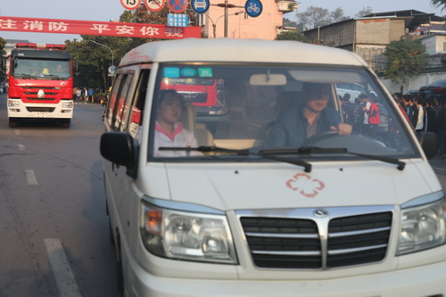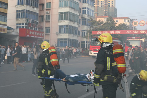 与此同时,接到“报警”的市消防支队消防车和救护车也已到达了“火灾现场”。两名消防队员佩戴空气呼吸器冲进“火场”搜救被困人员,用担架抬着“被困受伤人员”送至救护车上;其它消防战士则紧张有序地进行“灭火”的准备,并进行“灭火”操作直至彻底压制住“火势”。