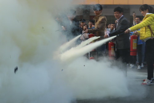 演习结束后,王万山副校与同学们一起用灭火器进行了灭火演练。