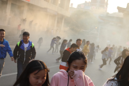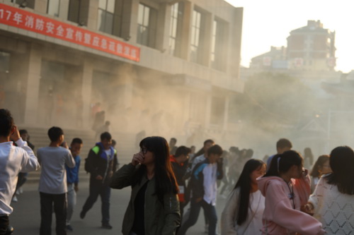 随着副校长王万山“演习开始”的一声令下,主校区大礼堂内立刻“大火熊熊”,大礼堂门口有同学发现“火情”后大喊“着火了!着火了!”,随着“火势”越来越大,大礼堂内烟雾弥漫,师生们用“湿毛巾”捂住口鼻,在引导员的组织下低姿弯腰、有序地跑向各个紧急出口,迅速远离“火场”,撤达了室外安全地带。