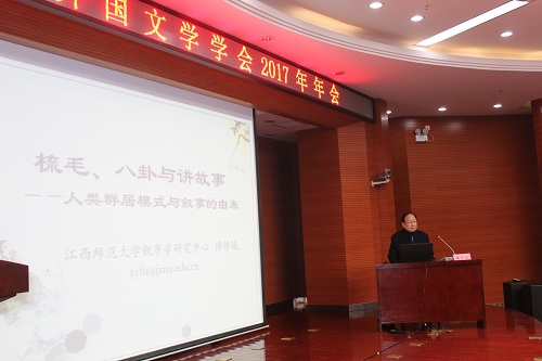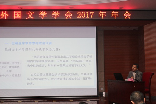 本次大会主要议程包括11月18日上午的大会主题发言和下午的分会场学术讨论,就“外国文学研究的前沿理论”、“中外文学叙事传统比较研究”、“媒介、符号与外国文学研究”、“外国文学作家、作品研究”、“外国文学在中国的接受、影响研究”、“外国文学中的中国形象研究”等主要议题进行了深入、广泛的探讨。大会主题发言包括:傅修延教授的《梳毛、八卦与讲故事——人类群居模式与叙事的由来》,张开焱教授的《巴赫金思想学术的政治泛音与极化思维模式》,李磊教授的《灵魂的投影,内心的独白——谈美国诗人E·E肯明斯的几首诗歌》。三位专家的发言十分精彩,将本次年会推向高潮。下午的分会场学术讨论同样十分精彩,在3个分会场同时进行,就外国文学的前沿理论、研究方法、叙述技巧、文本阐释等诸多方面进行了讨论与交流。