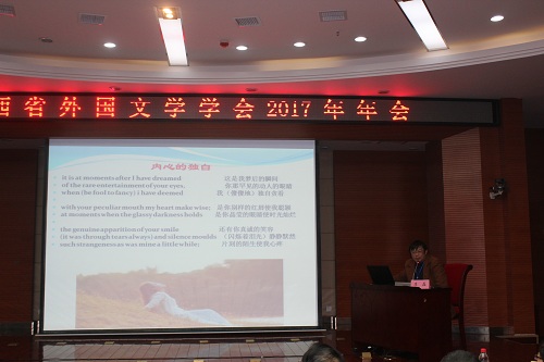 为了构建赣鄱学人的学术共同体、加强江西省外国文学研究的交流,推动江西省外国文学研究的深入发展,倡导外国文学研究的新范式、新理论、新方法, 11月17-18日,由江西省外国文学学会主办,九江学院外国语学院、九江学院文学与传媒学院共同承办的江西省外国文学学会2017年年会在永利yl23411集团官网主校区成功举行。永利yl23411集团官网副校长陈春生出席了本次大会,并参与了学术交流。以江西师范大学博士生导师傅修延教授、厦门大学张开焱教授、广东仲恺农业工程学院李磊教授、江西省外国文学学会会长刘茂生教授为代表的省内外70多位专家、学者及硕、博研究生参加了本次学术会议。会议由九江学院外国语学院周志高教授主持。