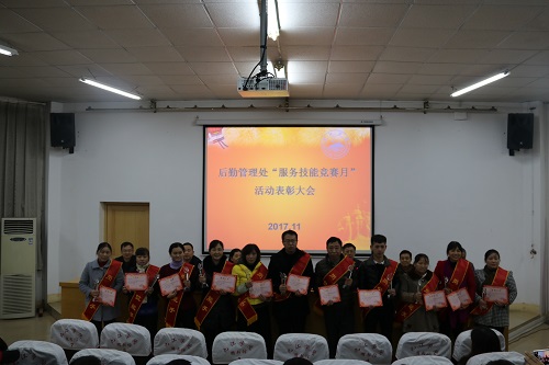 会上,后勤管理处党委书记张红涛宣读了《关于表彰服务技能竞赛获奖人员的决定》,鲁彬等41人次先进个人获得表彰。在欢快的乐曲声中,夏副校长和后勤管理处班子成员为获奖人员颁发了获奖证书和奖牌。