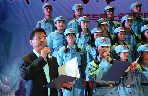 伴随着激昂的音乐响起, 晚会在激动人心的大合唱《游击队之歌》中拉开帷幕。接着,刘晓东校长带领旅游与国土资源学院合唱团演唱了歌曲《我的祖国》。刘校长浑厚高昂的声音,带领我们来到了那个战火纷飞的年代,向我们展示了一一幅幅壮丽的图画,引人入胜。在歌声结束后,我们仿佛还能听到绕梁激昂的歌声,让人回味无穷!