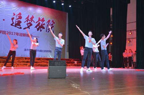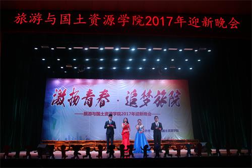 12月3日晚,旅游与国土资源学院在主校区大礼堂举行了2017年迎新晚会。校长刘晓东到场观看晚会并领唱合唱《我的祖国》,学生处、校团委负责人、旅游与国土资源学院党政领导以及学院全体师生共同观看了演出。