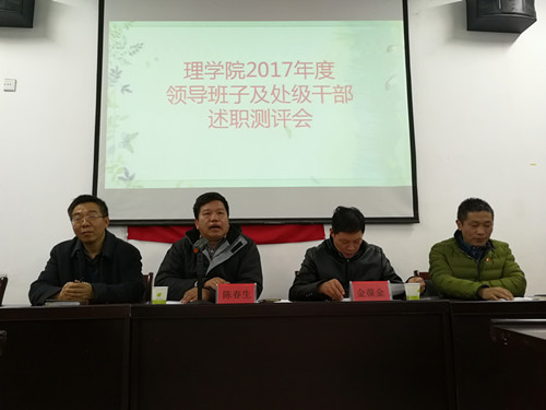 会上,理学院党委书记邹国辉、院长周金贵分别作了2017年度党委工作总结和行政工作总结,并就个人年度工作进行了述职,理学院副院长马军、魏健宁、査代奉就个人廉洁自律情况和年度分管工作进行了述职,在全体教职工范围内进行了测评。