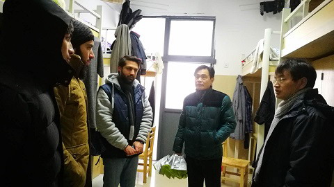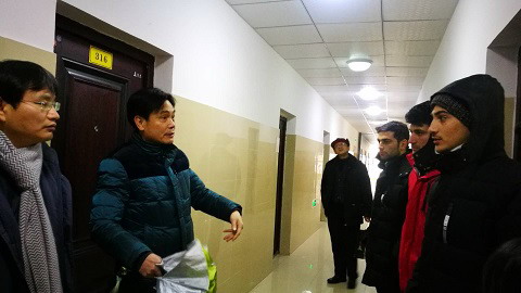 在留学生宿舍楼前,杨副校长叮嘱楼栋值班人员一定要在楼道出入口铺设防滑垫,以防意外发生。在留学生房间,杨副校长与留学生们亲切交谈,嘘寒问暖,了解他们寒假期间的生活和学习情况,叮嘱他们多穿衣服,注意防寒保暖,注意用电和外出安全。当了解到宿舍内近期热水供应不畅后,杨副校长与赶来的后勤管理处处长姜东升、水电管理中心主任李刚一起现场办公,拿出方案,解决了留学生宿舍热水供应问题。留学生们对冒雪来看望他们并帮助他们解决实际困难的学校领导和各部门的同志表示十分感谢。
