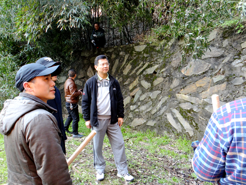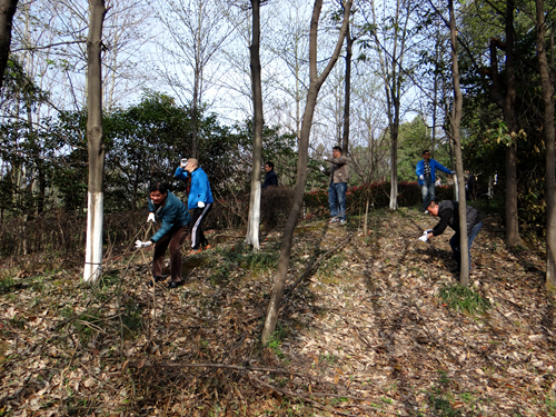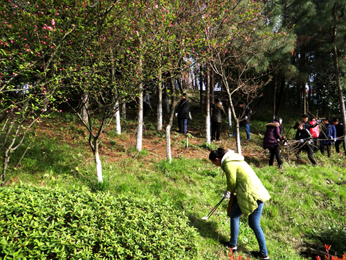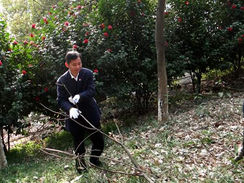 老师们有的拿着扫帚清扫落叶,有的拿着火钳捡拾藏在花坛里的垃圾,有的拿着水桶和小铲子清理墙壁上的牛皮癣,还有些身手敏捷的老师钻进山坡上的树丛里,把被雨雪折断的枯树枝扎起来,堆放到方便运走的地点。劳动过后,女老师们被汗水润湿的脸庞更显红润,男老师们早就把外套脱在一旁“撸起袖子加油干”,和平时讲台上温文尔雅的形象判若两人。