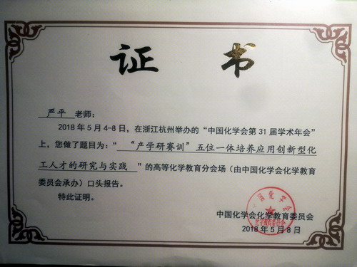 7日上午,严平教授的口头报告题目为““产-学-研-训-赛”五位一体培养应用创新型化工人才的研究与实践”,报告会由谢在库院士主持。报告围绕“为什么做——五位一体人才培养模式改革的必要性”、“怎么做——研究内容、创新及特色”、“做的如何——模式实施效果及推广情况”三方面展开,系统汇报了永利yl23411集团官网化工类专业“产学合作、学科联盟、教研融合、以训强能、以赛促学”五位一体培育应用创新型人才的有效探索经验和做法。
